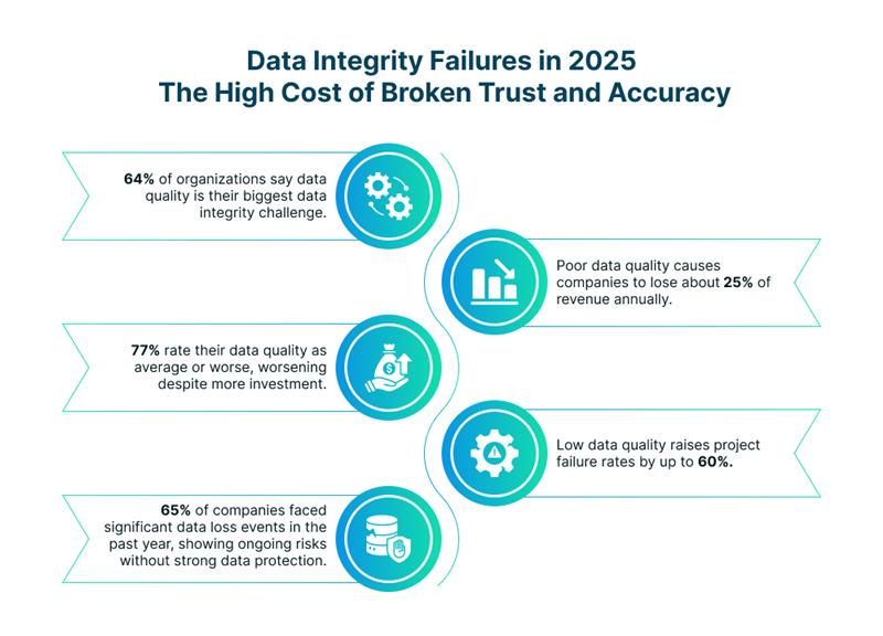 Revenue loss due to poor data integrity in financial systems is a silent but colossal threat, eating away an estimated 25% of annual revenue for many companies. To put it into perspective, for instance a financial institution generating $100 million in revenue might be unknowingly losing $25 million yearly just because of inaccurate, inconsistent, or incomplete data that disrupts operations, compliance, and decision-making. In 2025, this challenge has been a top strategic concern for CFOs because every dollar lost to data mishandling directly reduces the bottom line with no chance of recovery, representing a pure loss.