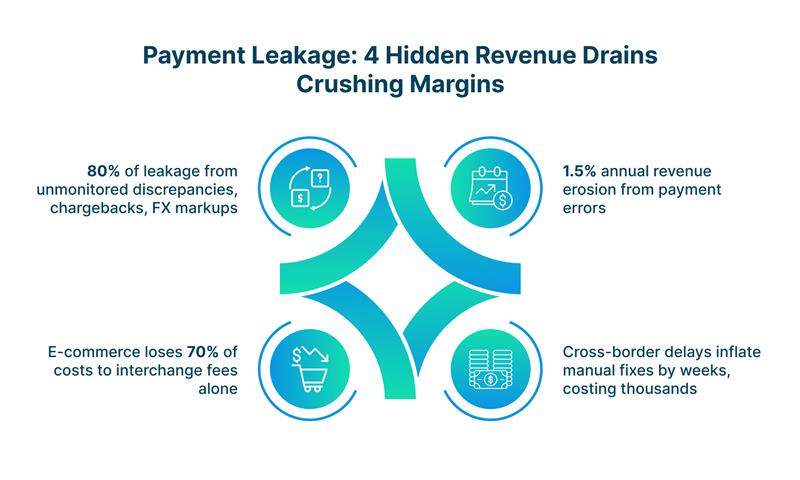 Beyond visible fees, fintechs and PSPs face a silent margin-erosion problem from hidden revenue leakage. Up to 80% of leakage stems from unmonitored discrepancies, chargebacks, FX markup margins, and failed transactions that go undetected due to fragmented payment ecosystems. For example, e-commerce firms see roughly 70% of their costs driven by interchange fees, yet they frequently fail to capture lost fees from failed or duplicated settlements.